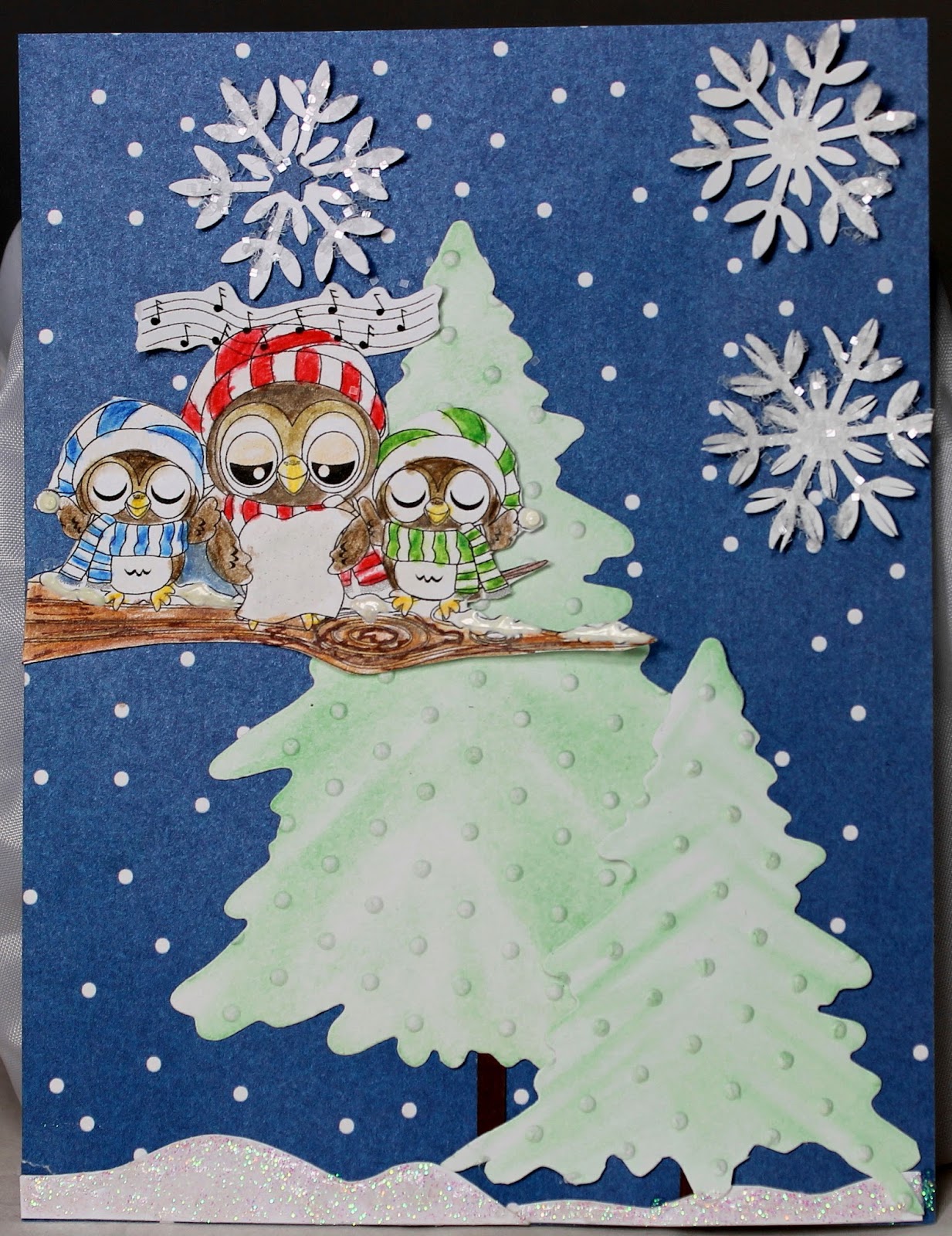 What a wonderful holiday card! I just adore that image, those little owls with their hats and scarves are so darling! Love the embossed trees and deep blue night sky background! Very festive. hugs :)